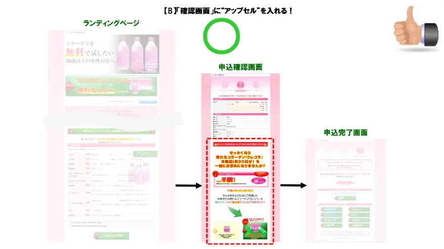 面倒なフォームを記入して申込確認画面まで辿り着いたお客様に、ここぞというタイミングでアップセルオファーを出すことを「確認画面でアップセル」と売れるネット広告社では命名しました。面倒なフォームを記入して、完了まであと一歩のところでアップセル商品を提案すると、お客様の心理状態をうまく掴むことができます。