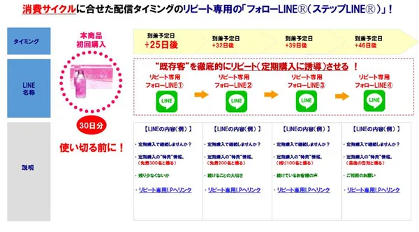 また、30日分の本商品を申込んだお客様には、商品が残り少なくなる商品到着の“25日後”くらいに「定期(サブスク)で継続しませんか?」というリピート専用「フォローLINE®(ステップLINE®)」を送ります。