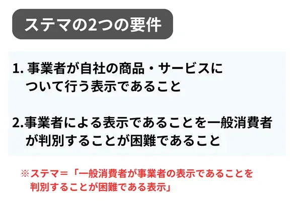 消費者庁が2023年3月28日に決定した「『一般消費者が事業者の表示であることを判別することが困難である表示』の運用基準」によると、ステマにあたるかを判断する際は、次の2つの要件に該当するかどうかがポイントになる。
